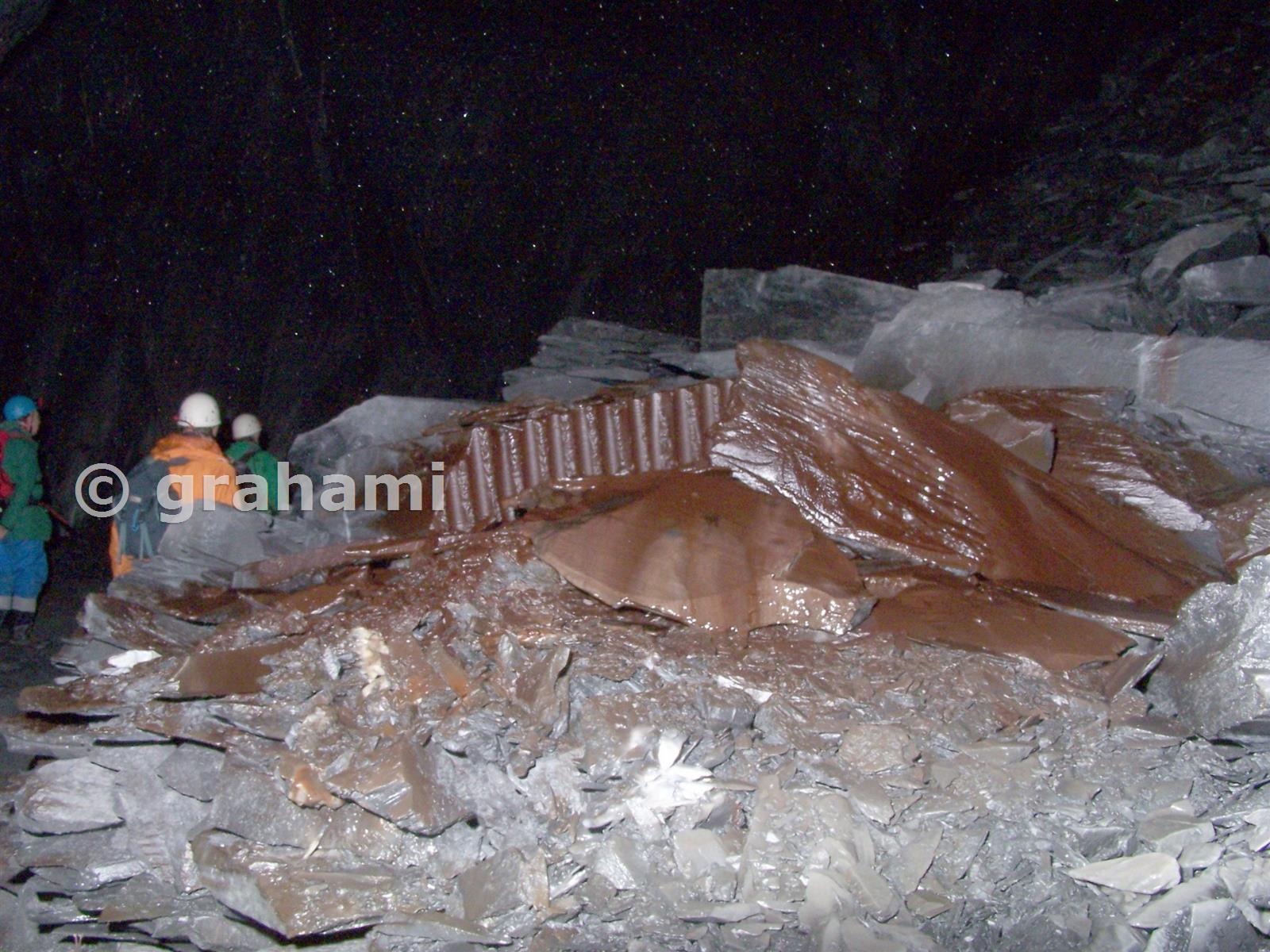 A piece of channelled rock covered in smooth iron stain - like enamelling - in the northen part of the "Cathedral" - I think. Floor 6.
