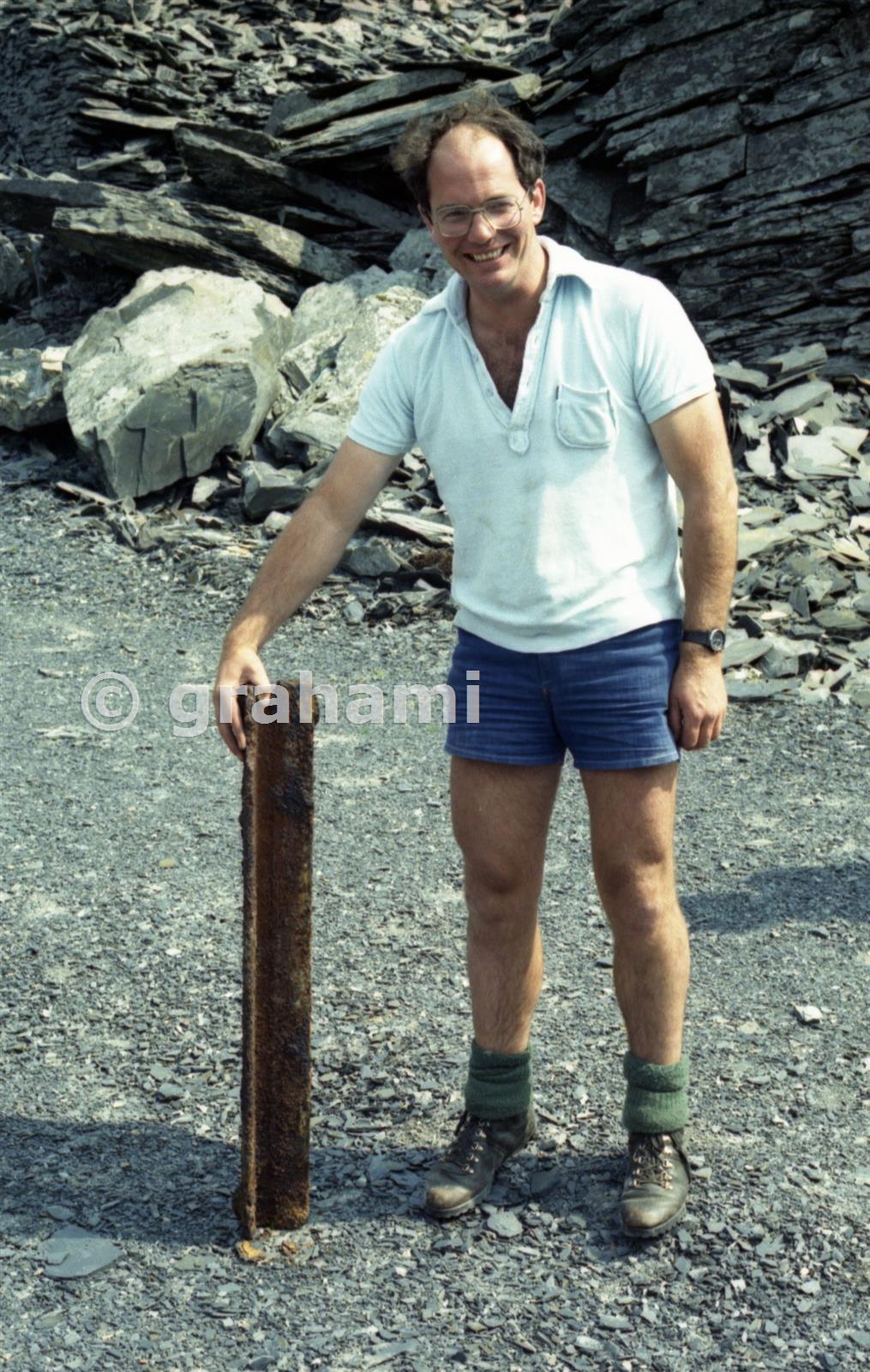 The late Merfyn Williams proudly displays the great discovery of a plateway rail in Diffwys.