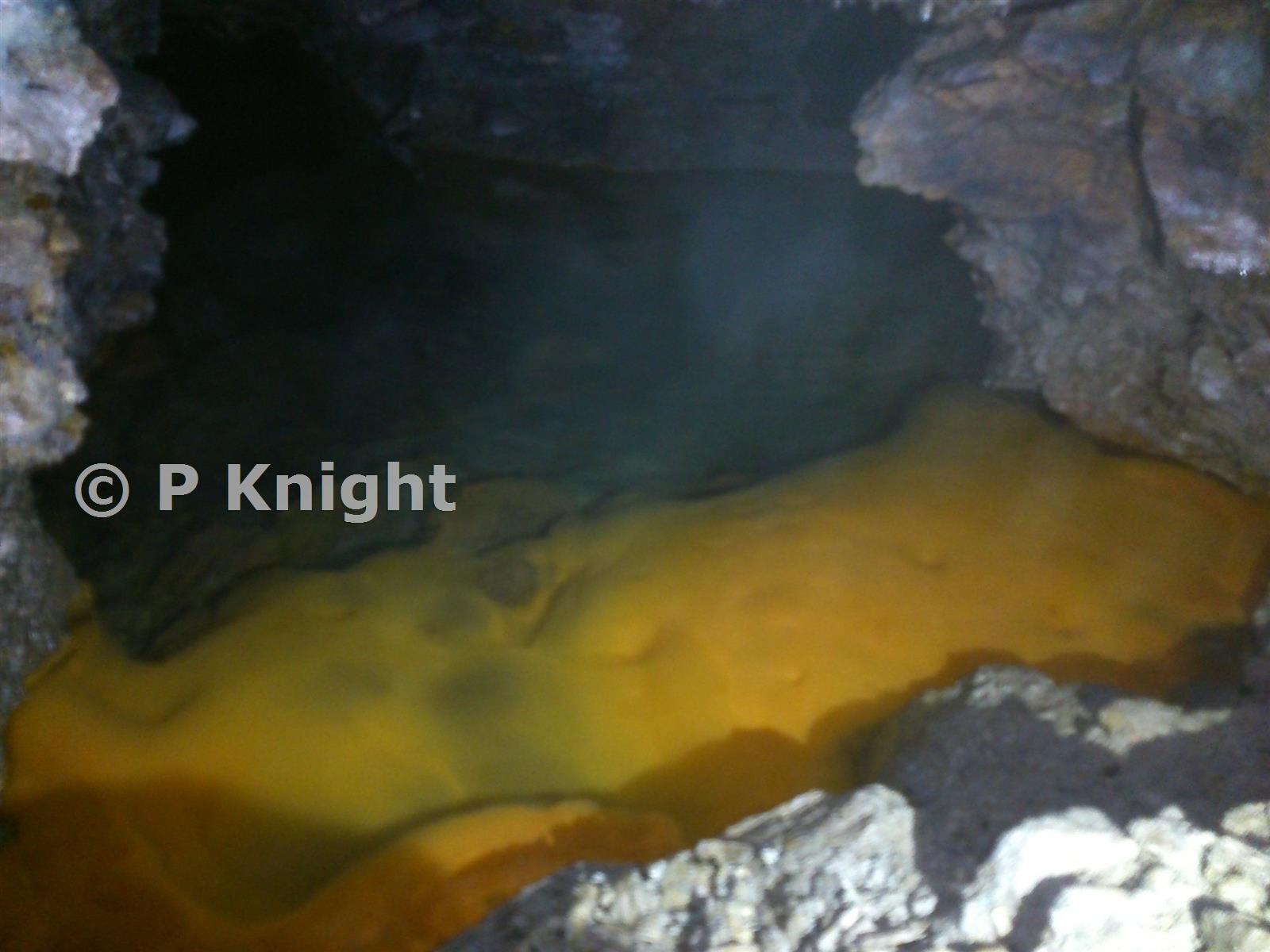 This chest deep pool is after the dam. To the right is the shaft and straight on after a few meters and a low ceiling is the stope. The water has a cloudy rusty bloom that is easily dispersed.