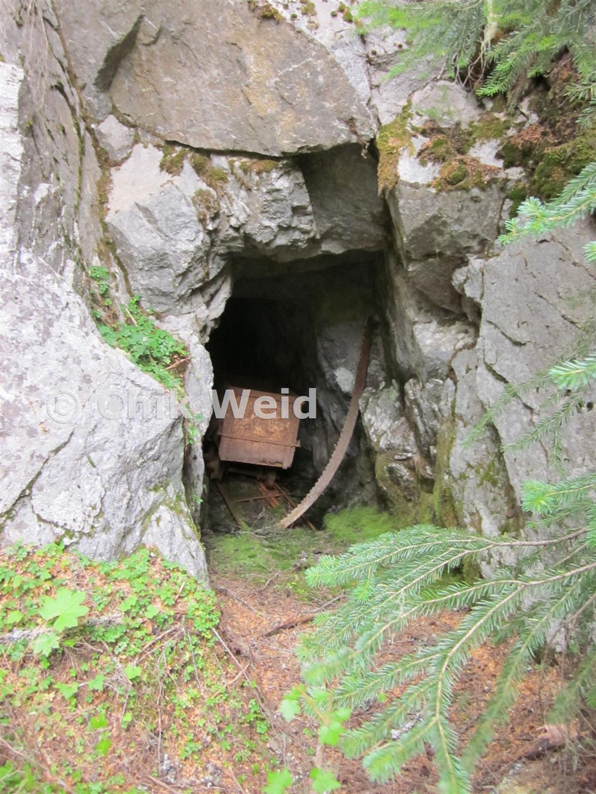 Crosscut Saw leaning in portal beside ca. 1900 Truax ore car.