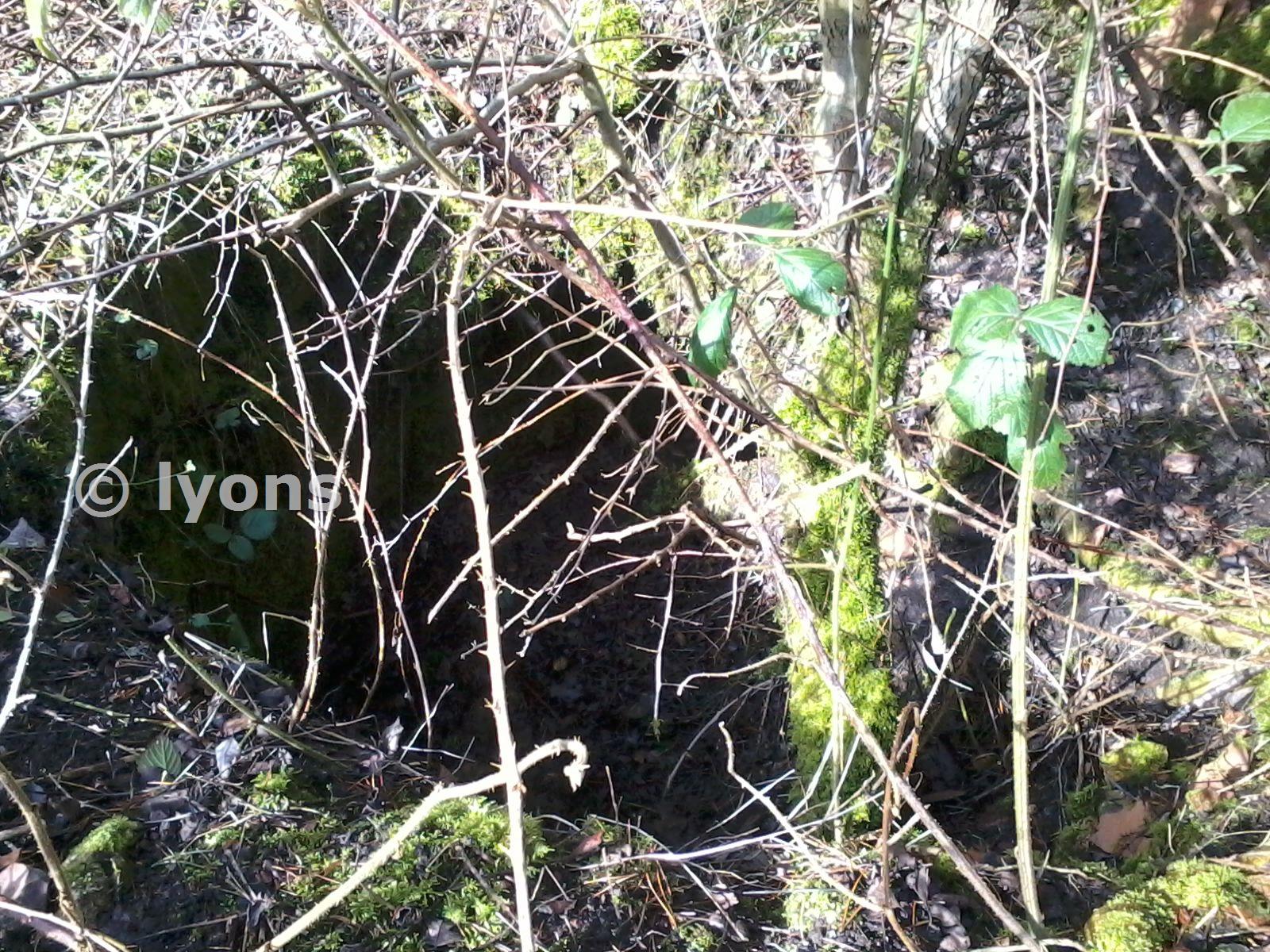 The same shaft from a different angle, badly backfilled and possibly collapsed in on itself.. lots of Brick infill and curved stone work.