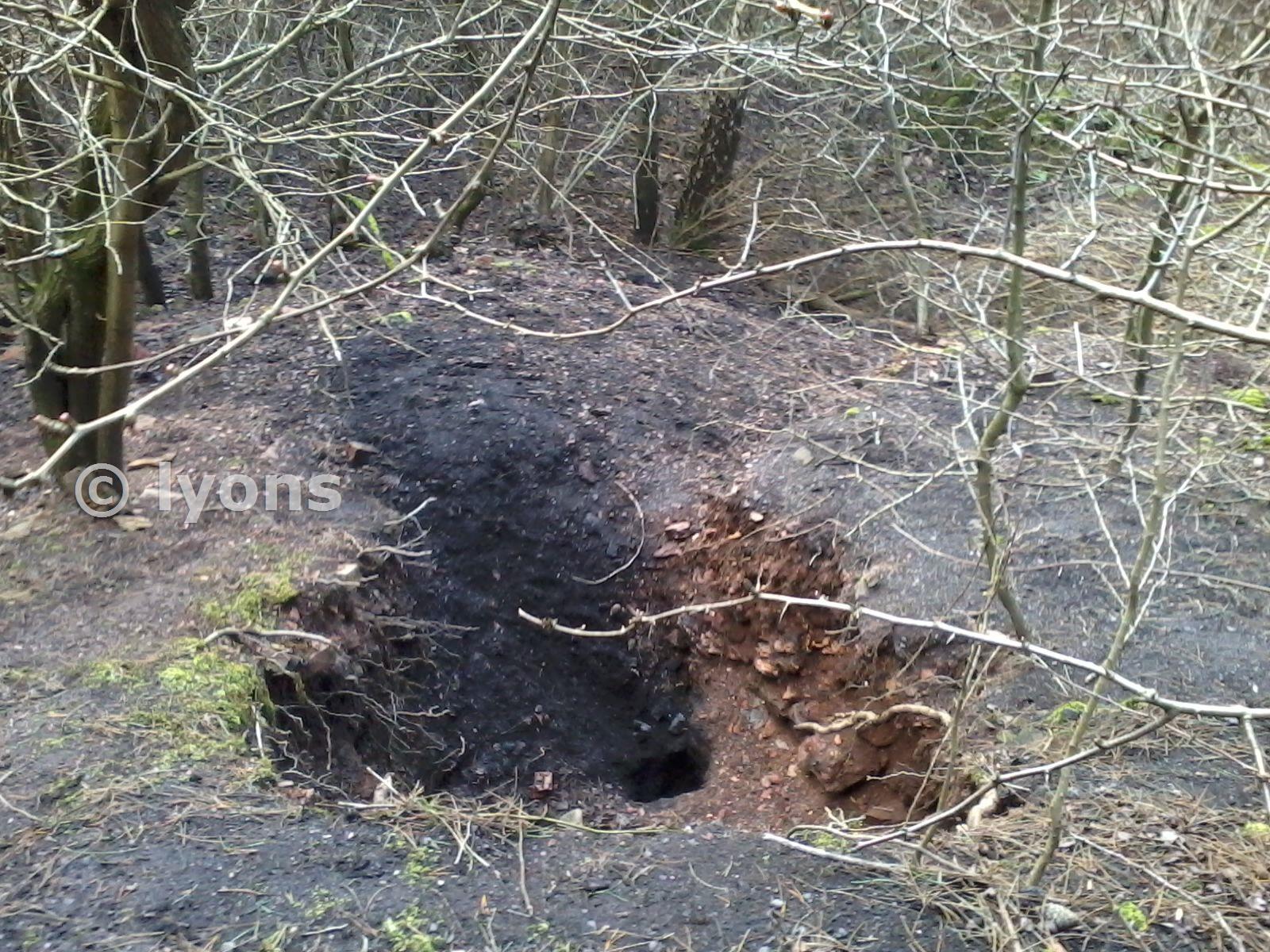 There are a number of pit falls it the densely wooded area, including bits of Iron sticking up from the ground. This one looks to have had recent activity with someone digging.