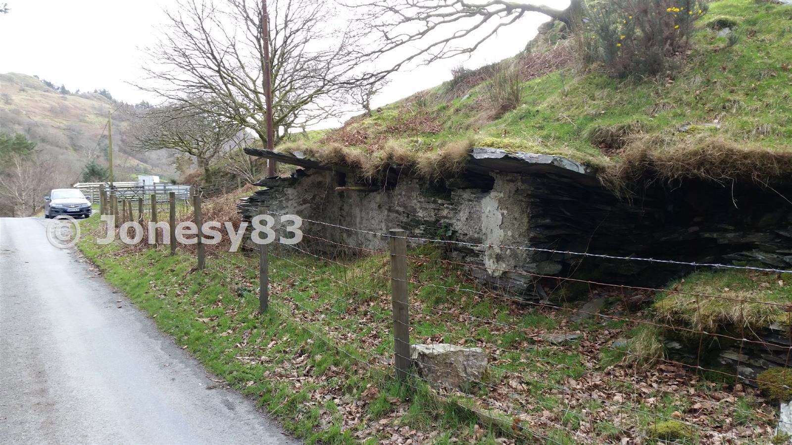 Possible remnants of Gwal / Shed maybe office (Lime / chalked interior walls, but apparent Slab roof?) Pit to the extreme right of photo, spoil heap to extreme left. Further down the road past the car and downhill are remnants of wheelpit(s) on left, and "Machine House" on right, with Incline remnants in feild.