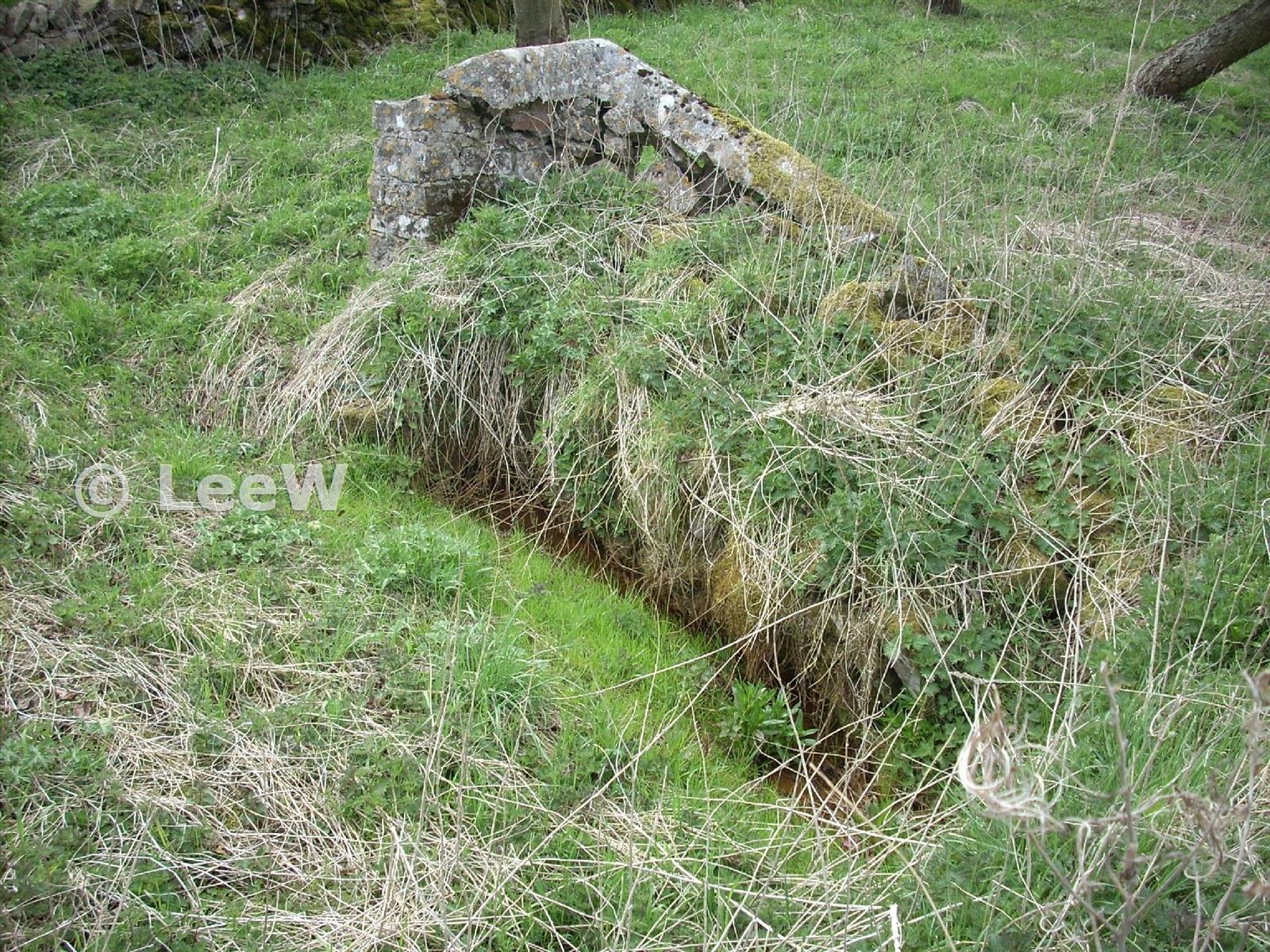 This is slightly offset from the line of shaft hillock and just of the lane. There is ochreous water emanting from the bottom of a stone structure (24 April 2009)
