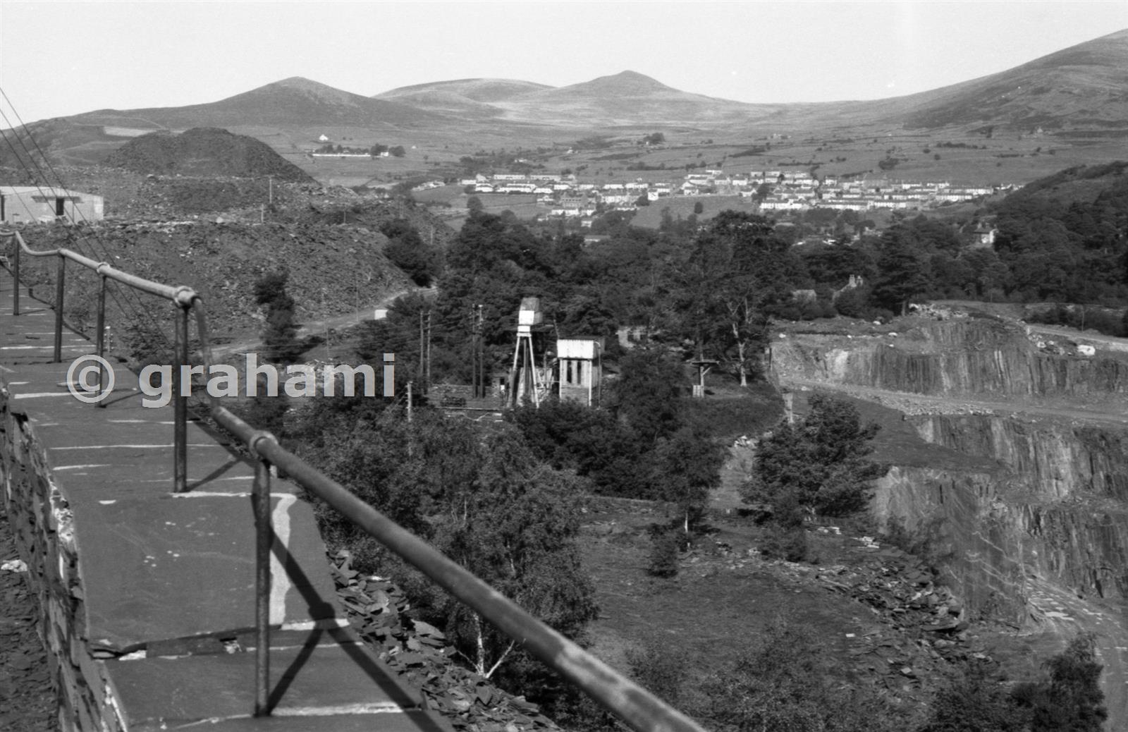 A general view of the east end of the quarry with Bethesda in the far distance. Again the tip in front of the mills when this picture was taken now entirely surrounds the Princess May balance and extends to the enge of the open pit.