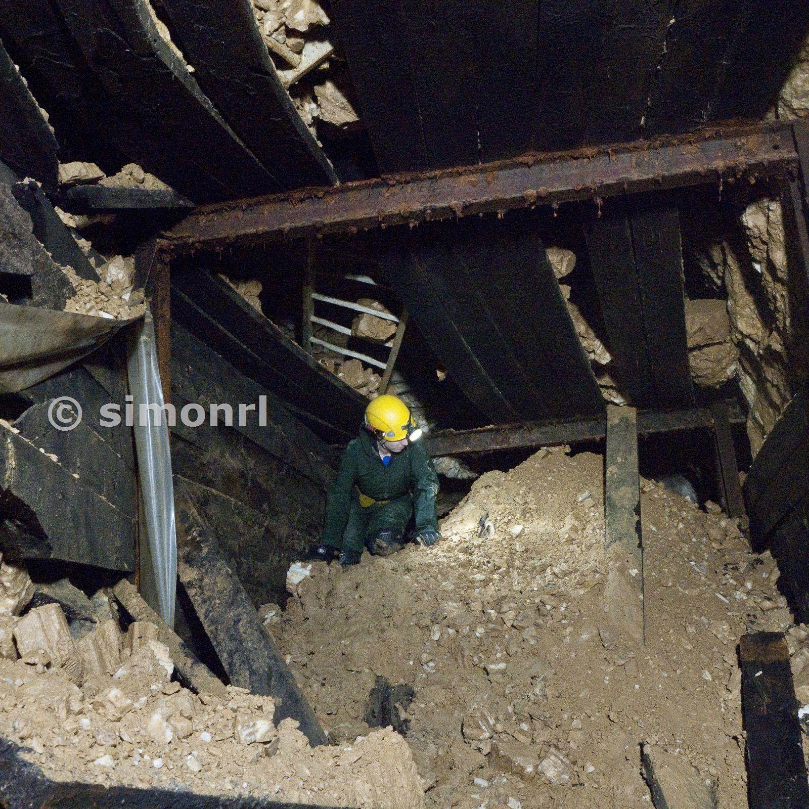 Props and timbered section, Rockchick emerging Hendre Spar Mine October 2011