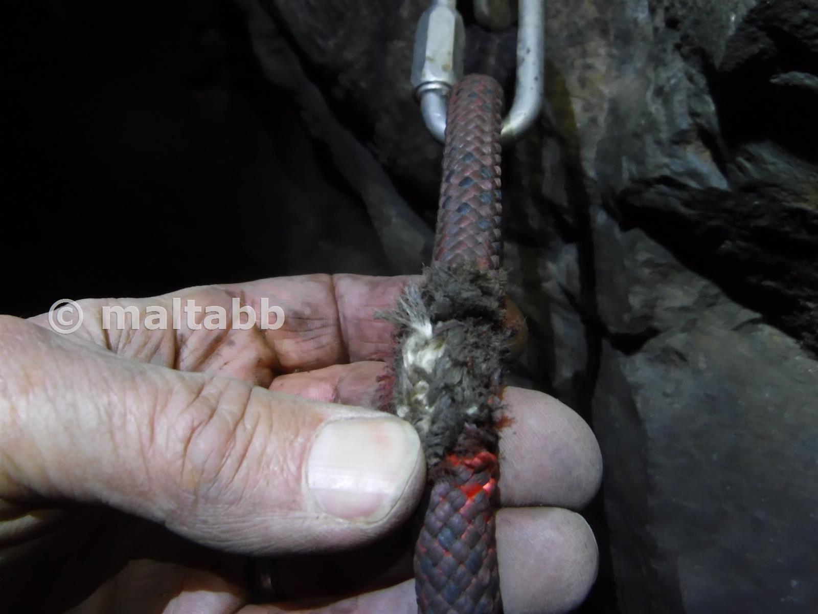 Badly worn rope on 2nd abseil on Smallcleugh - Rampgill through trip via Prouds Sump