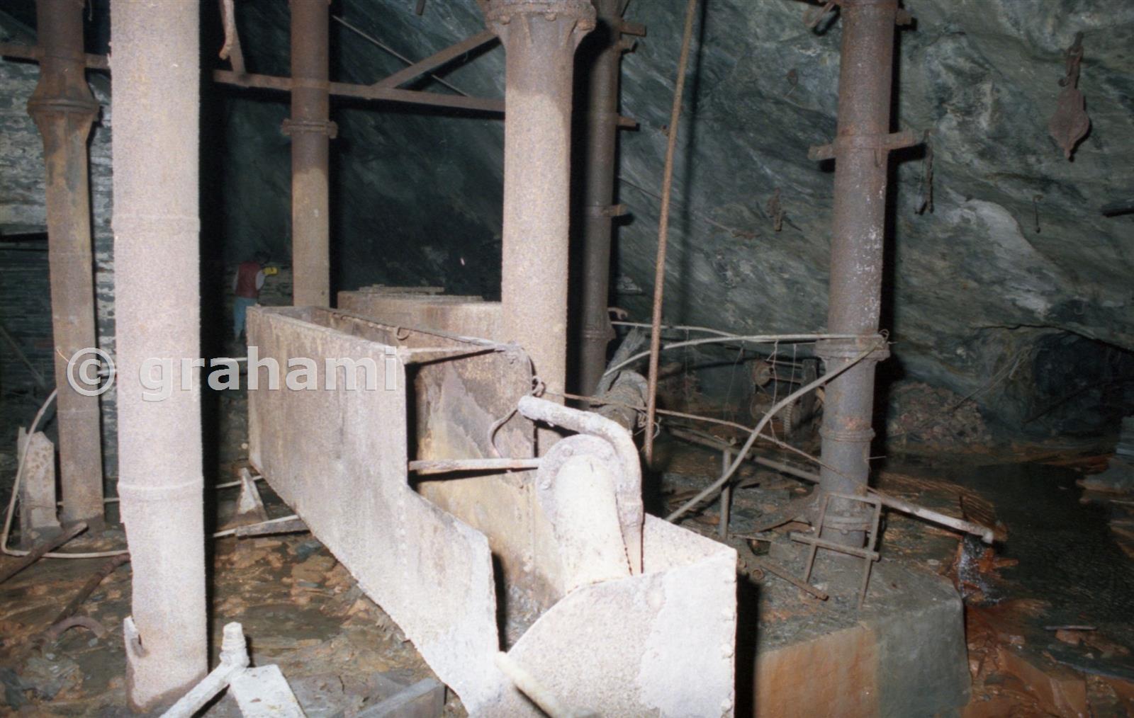 The pump was a 3-throw beam pump discharging into this iron trough. The pump beams were driven from a 3-throw crankshaft, itself driven by either a water turbine or a marine type condensing steam engine. The selection was made through dog clutches at either end of the crankshaft. Drive from the turbine was via belts and gearing, the steam engine drove simply through gearing.