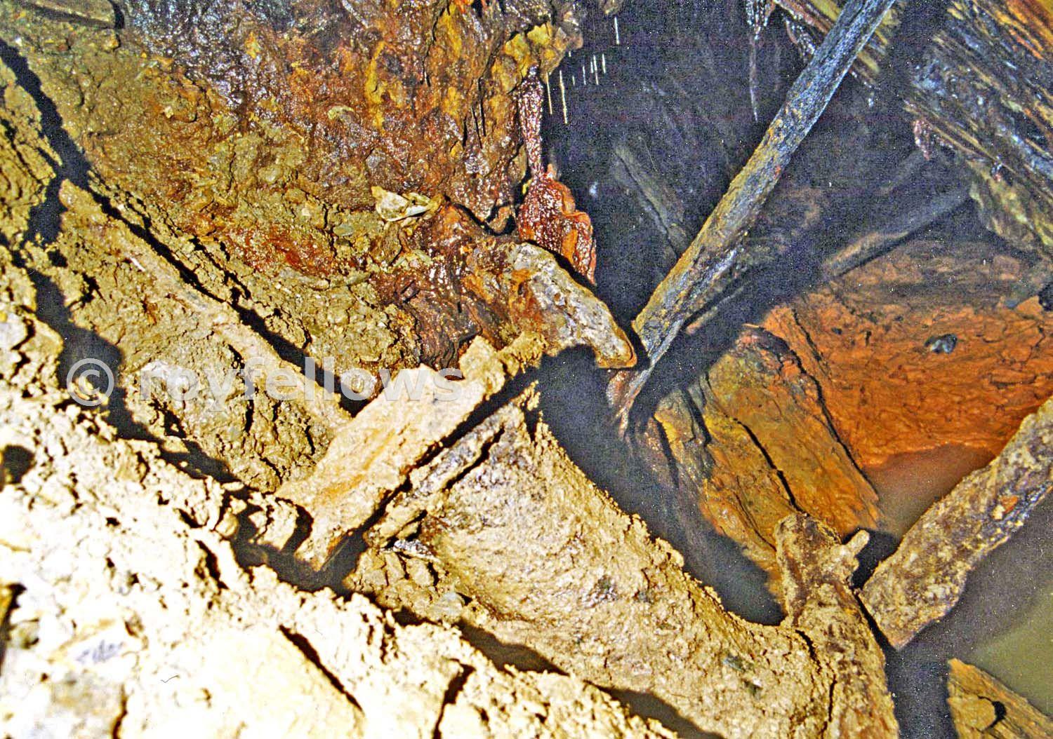 The rod extends upwards in to a fill that fortunately chokes the shaft, fortunately because the shaft is filled to surface and the adit would likely be blocked at this point without the choke.