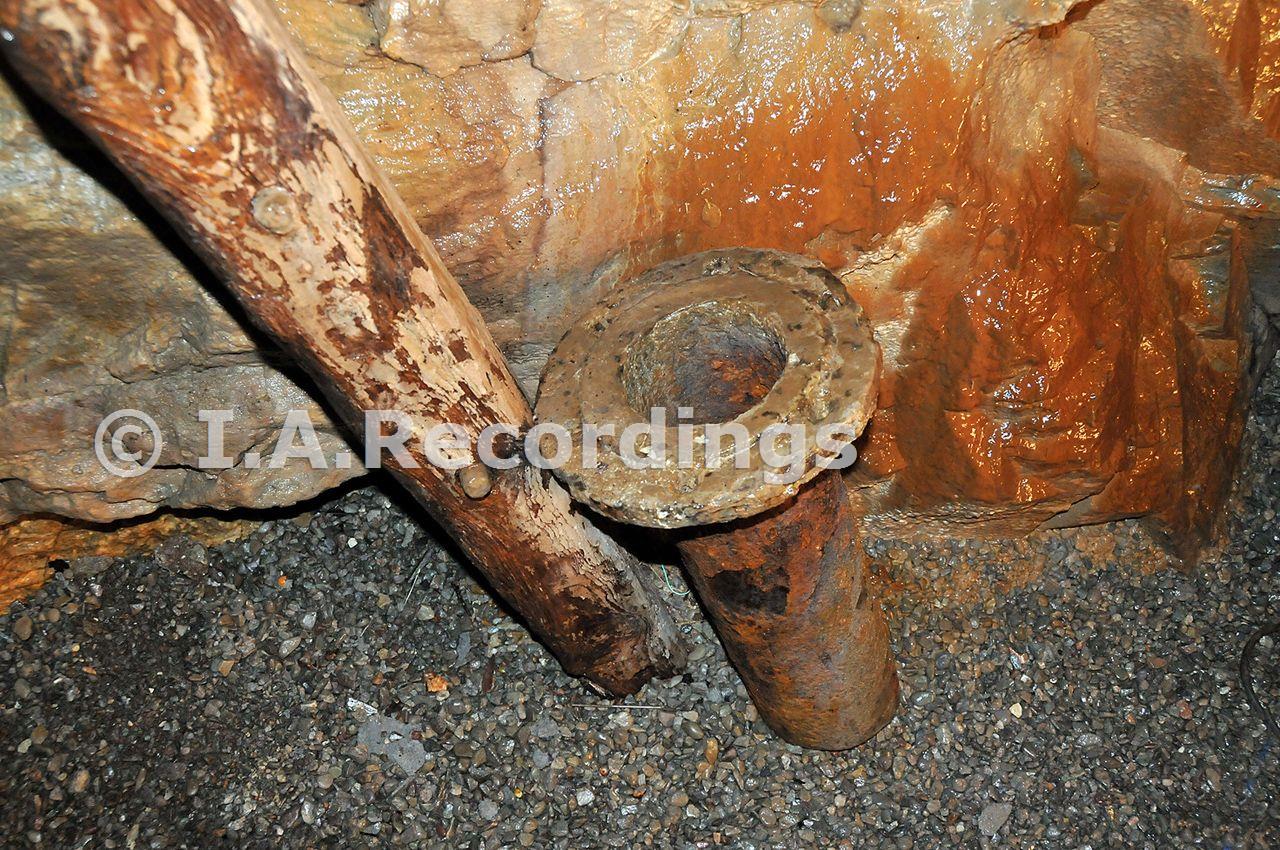 A length of pump rod and rising main pipe still in situ at the top of the stope about 40ft. below Gangway shaft collar. The pump rod can be followed down dip into the lower workings of the mine 120 feet below.