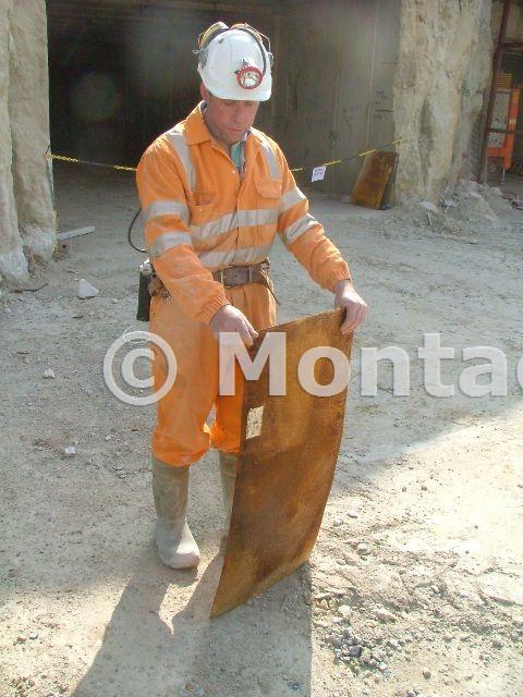 Hydrobags are steel pillows that are inflated hydraulically to force the cut block off their bases or walls. Used instead of wedges or low yeild explosives. Flattende after use by quarry traffic to make more fit the the scrap bin!