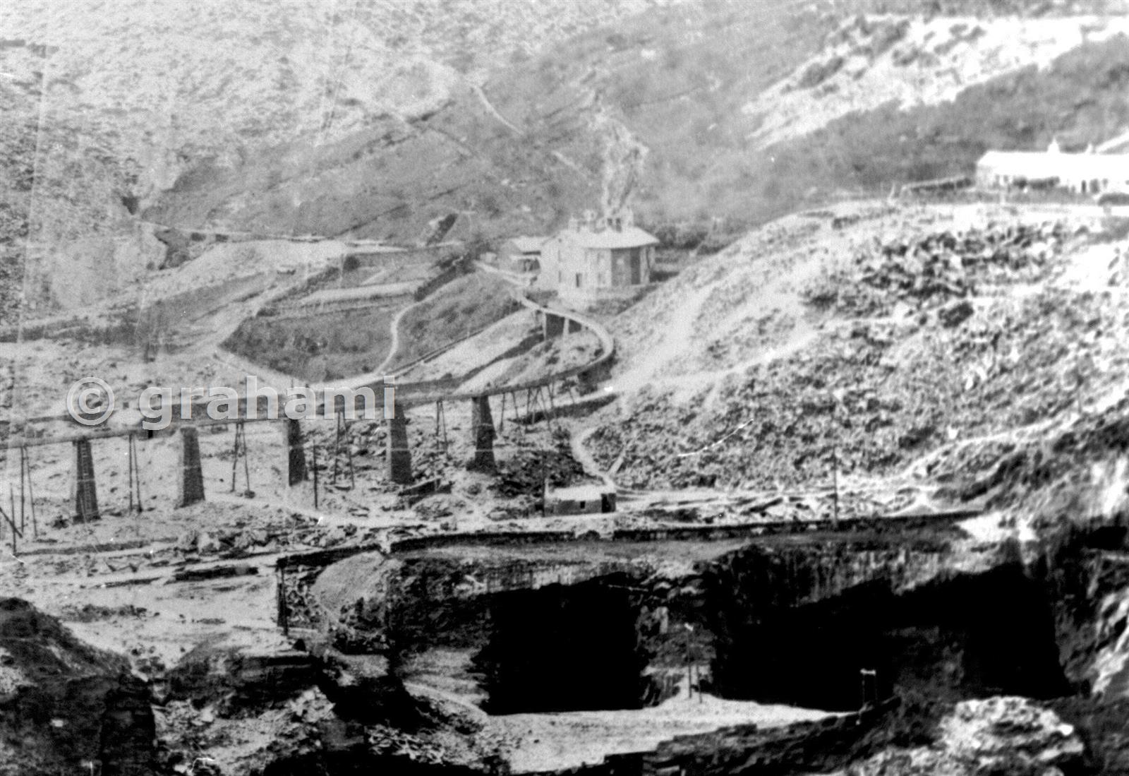 Enlargement from a glass plate print. This shows Quarrybank, the Votty manager's house, with its garden perched above the launder to Percival's Mill. The water fed, in order: Percival's Mill, The Slate pencil Mill, and the "Long" Water balance. A Floor Mill and the A-B floor water balance. B Floor Mill and the B-C floor water balance. C floor Mill.