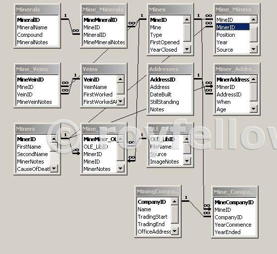 This is the table structure of the Cumbrian Miners database in the MS Access data file. Its purpose is to show how relationships work within a relational database. If you look at "Mines" and "Miners" you will see that they are related through a 'bridge' table "Mine_Miners", a miner can work at many mines in his lifetime, and a mine can emply many miners. So its a 'one to many' running both ways