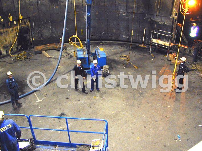 They are point at this plaque, which must have been under the hearth from the 1986 reline. http://www.aditnow.co.uk/Photo/Reline-2000-Centre-Line-Plaque-From-1986_105163/