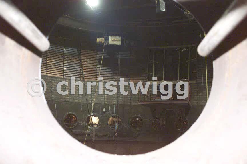 Looking in through one of the holes the tuyeres are inserted into. Copper cooling plates can be seen again a couple of levels up.
