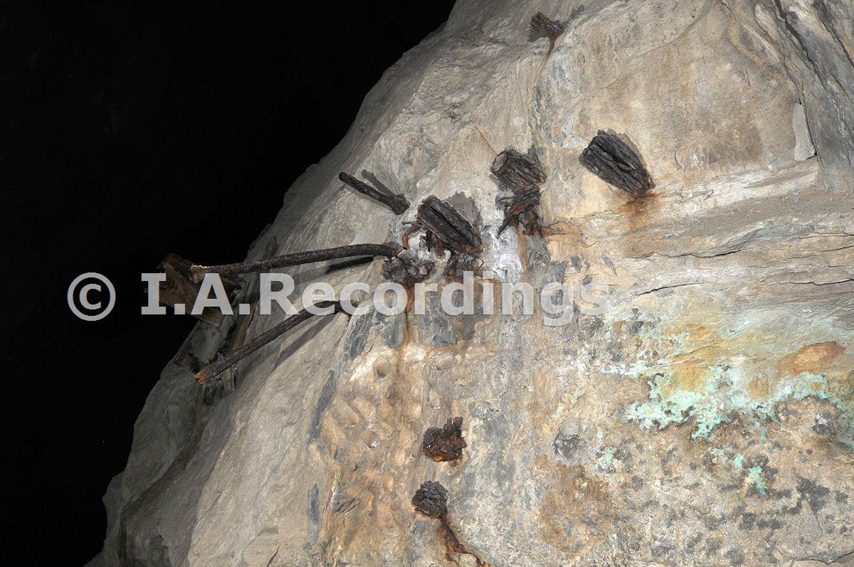 Bolts and remnants of the skip way for the Man Engine shaft - on the wall of Man Engine chamber (South East & West Lode). [October 2012] Note: Compare this with the 2002 pictures in the gallery by Martin Critchley, which show the skip rails still in position.