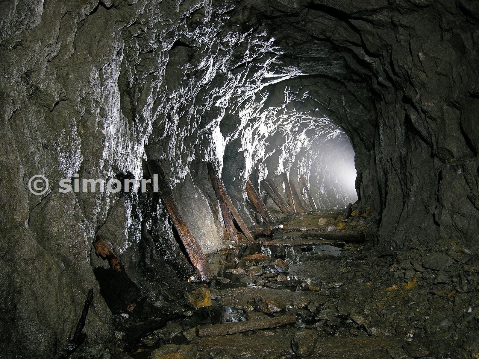 Removed track, with sleepers stacked against the tunnel wall, Eliza's Adit. November 2008