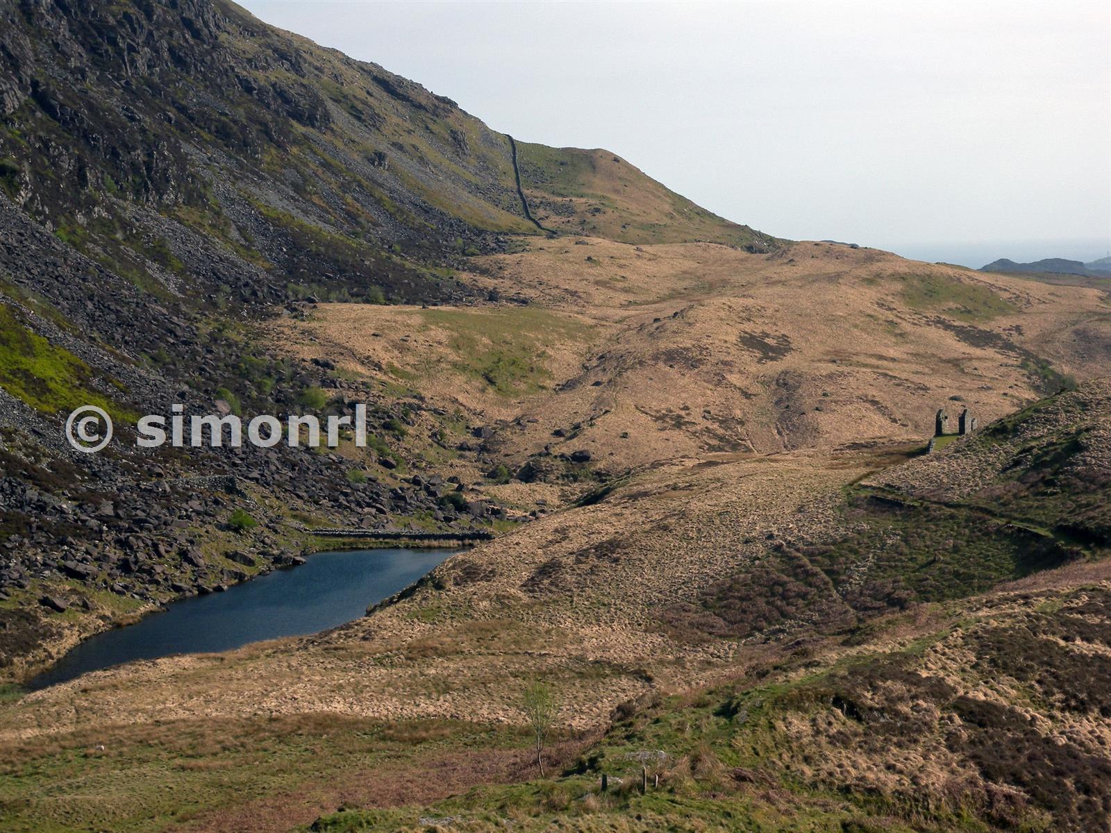 A view of the reservoir, tramway and incline winder building clearly visible Prince of Wales Slate Quarry, May 2010