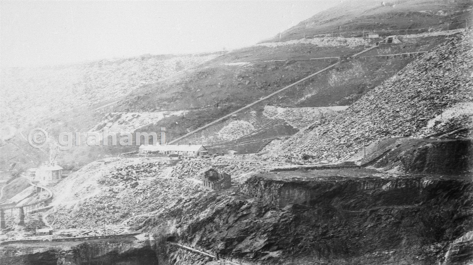 Enlargemnt from glass negative print. This shows the Rhiwbach No.2 incline. From left to right we have: The Percival's Mill Launder over the tracks. "Quarrybank" the Votty Manager's house. Maenofferen cottages - old ruin in foreground. New embankment carrying the Tuxford tip tramway under the incline. Votty watercourse carried over incline. Incline drumhouse. Maenofferen tip tramway. Upper watercourse.