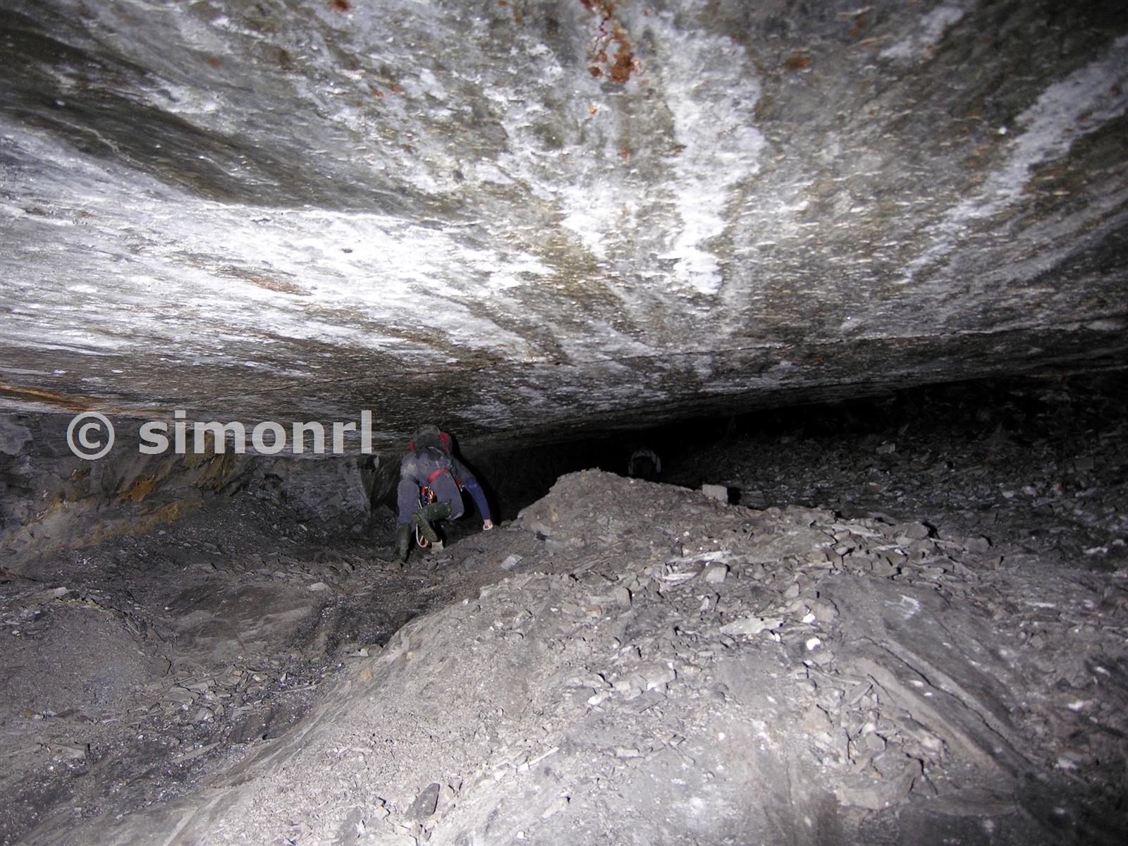 Scrambing up a narrow and partially filled chamber in Rhosydd.