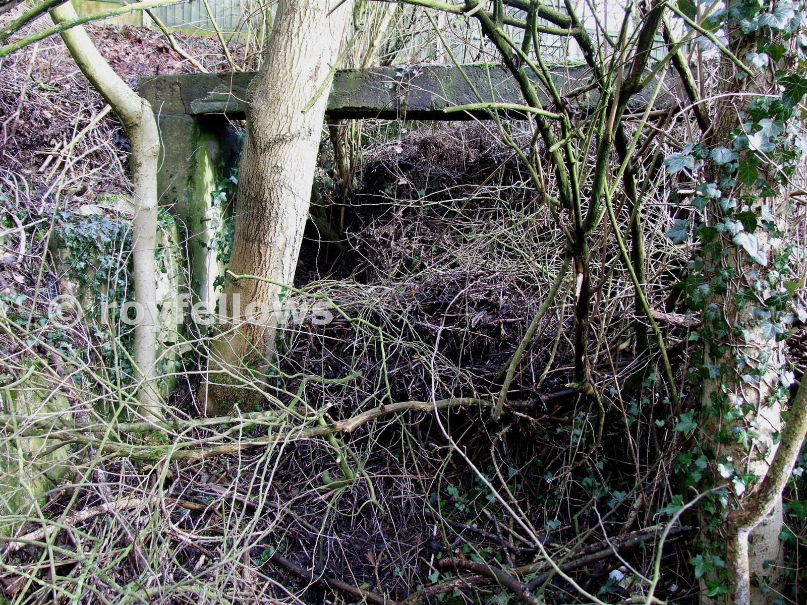 Comparison with the Dickie Bird archive photograph reveals the concrete cross member as the only recognizable feature. The decline itself has been filled in with rubble, and now nature takes over.