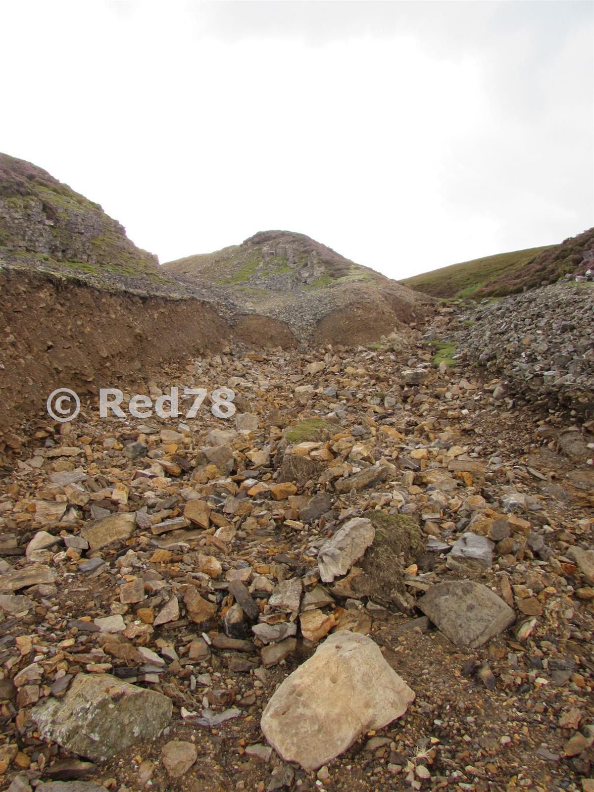 A huge volume of water cascaded down the old hush and moved an enormous amount of the old loose rock and spoil on the 30th July 2019. If you have a good eye you can pick up nuggets of lead left behind.