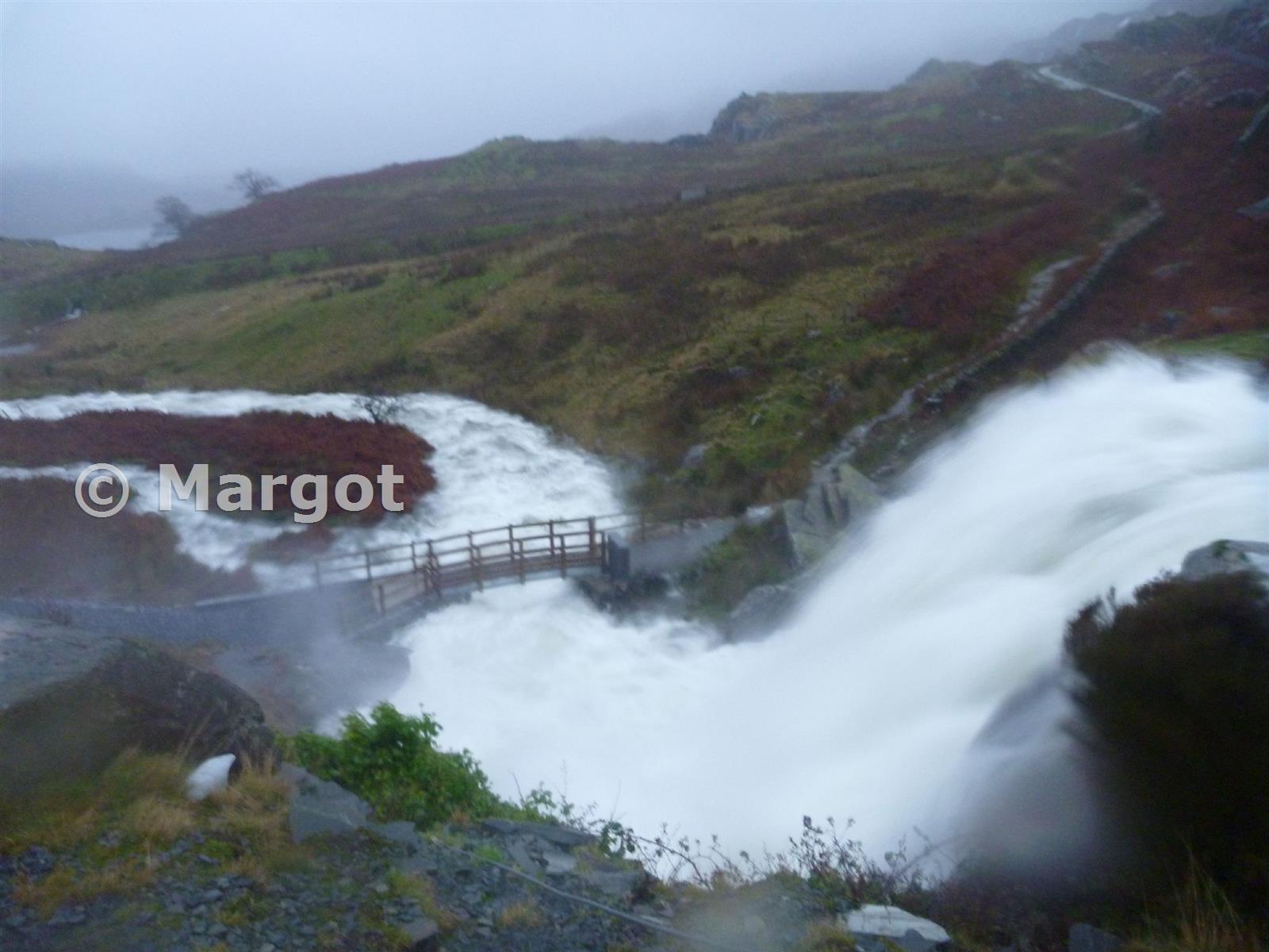 The swollen stream thundering towards the new bridge