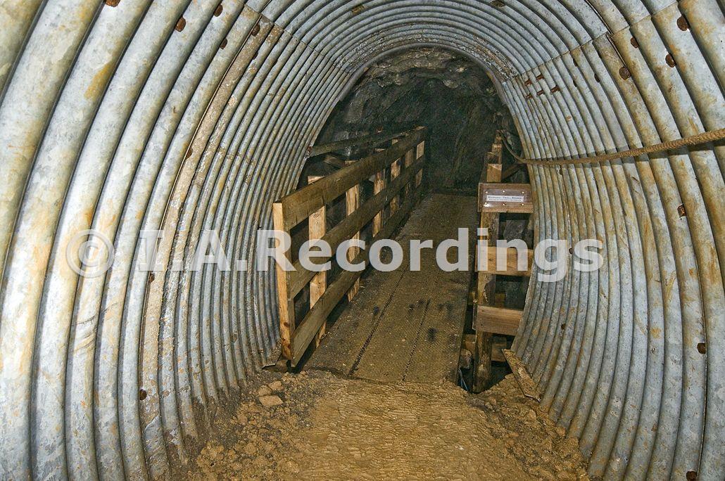 Inbye end of tube T4 (looking outbye over the wooden "Troll" bridge). The corrugated iron tube was built during the 1990s safety works by the Council, the wooden bridge was built more recently by the Shropshire Mines Trust to allow access for visitors to the bottom of the large stope.