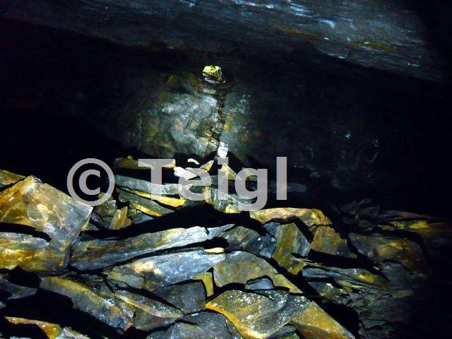 In one of the chambers, looking up over stacked deads.