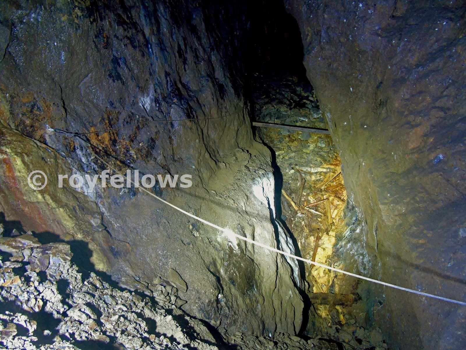 Traverse line fitted to reach the back. Explorers will go along the ledge and cowstails required. Beware a collapse into lower working at the very back. There is also a short blind exploratory level, so this and other factors indicate it to be the 10 fathom level.