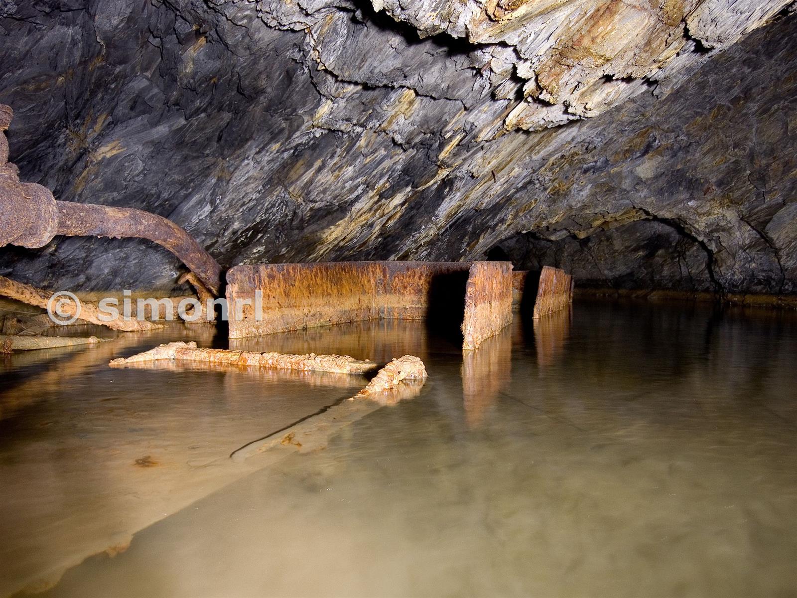 Partially submerged rubbish wagons, just off the back vein incline, E floor Cwmorthin slate quarry July 2009