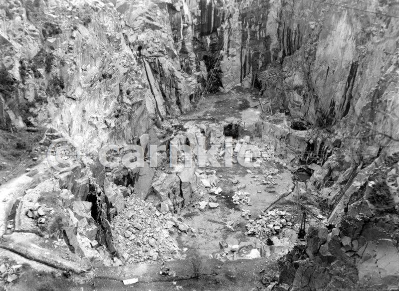 Rubislaw Quarry. Aberdeenshire. A view showing the huge oval pit-like form of this grey muscovite-biotite granite quarry with a smaller pit on the floor. The good stone was always at depth below the poor surface layers so the quarry became very deep. A method of hauling the stone from such depths was one using a local invention called 'blondin' wires. Several are seen stretched across the 122 m. deep quarry opening. Rubislaw is often regarded as the most famous of the Aberdeen granite quarries supplying building and monumental stone since it opened in 1741. Photo P000118. Reproduced with the permission of the British Geological Survey ©NERC. All rights Reserved.