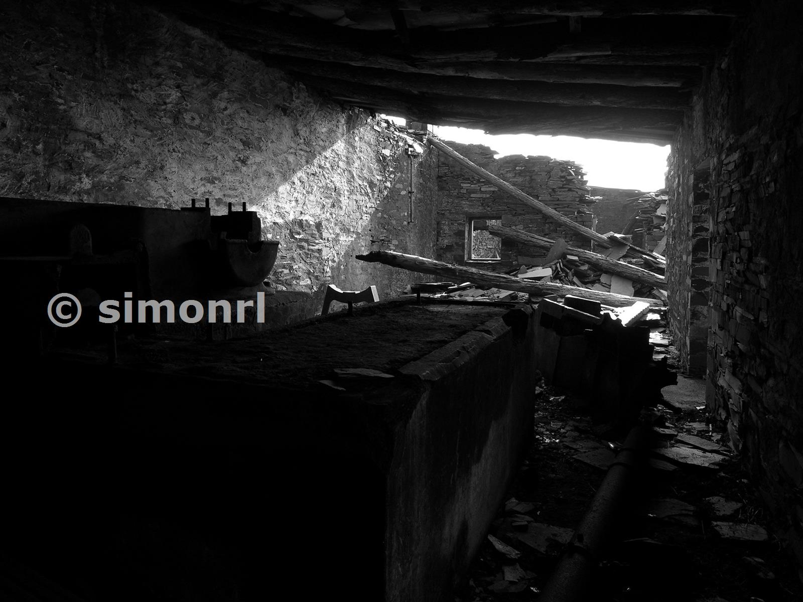 The roof has caved in on this building exposing the ruined machinery to the elements.