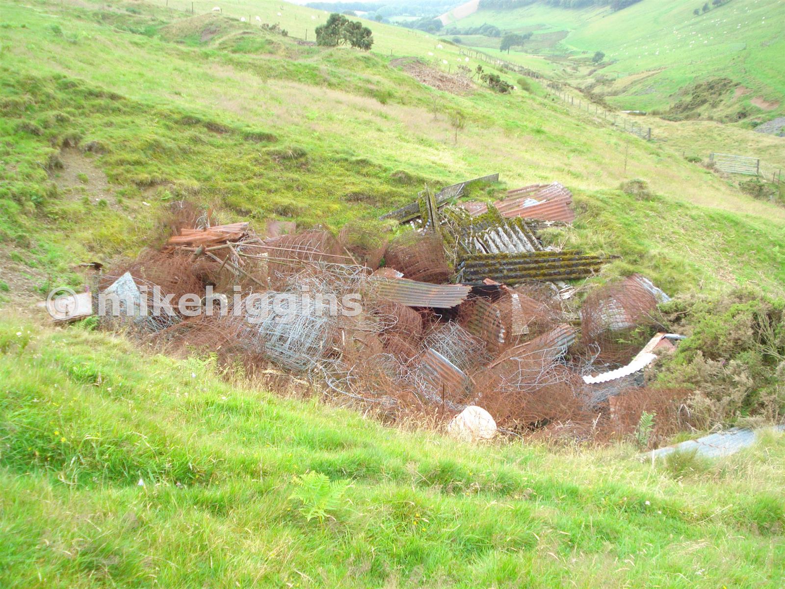 Top of another run-in shaft further west also filled with rubbish. Disturbed ground and hillocks in the background.