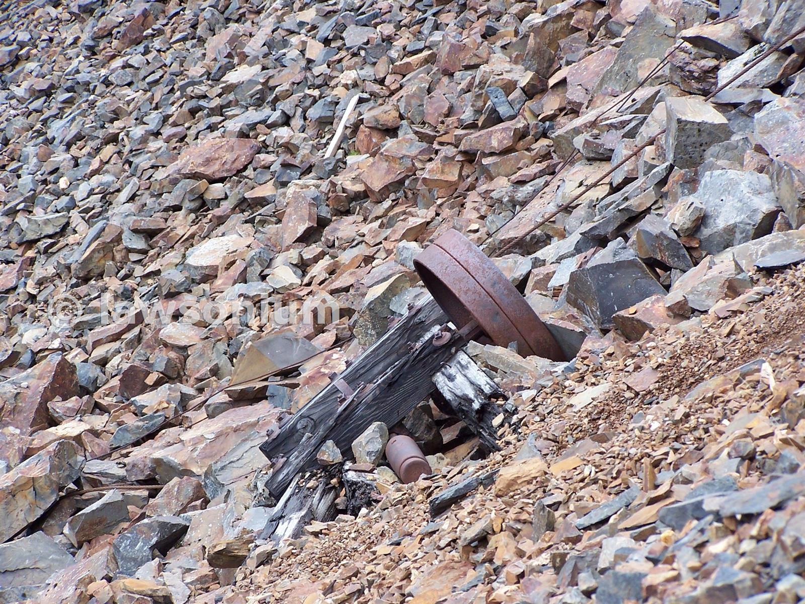 An intermediate wheel approximately half way up the 'incline'. The cable can be seen in the upper right corner of the shot. This is under a very steep scree slope which would be subject to large quantities of snow and subsequently has been buckled by years of shifting debris.