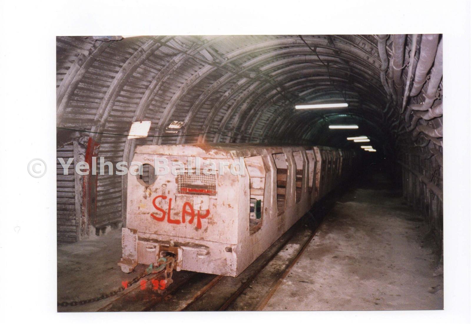 Carriages uncoupled and out of service at the end of mining. Shown at the top of the return drift (High Main Level). This was a single line drift with an automatic passbye at its halfway point it terminated at Brinsley Seam. The ascending and descending trains would be directed into two tracks opposite sides to pass whilst at speed. Quite a sight. You can see the Three Rails. All in situ.