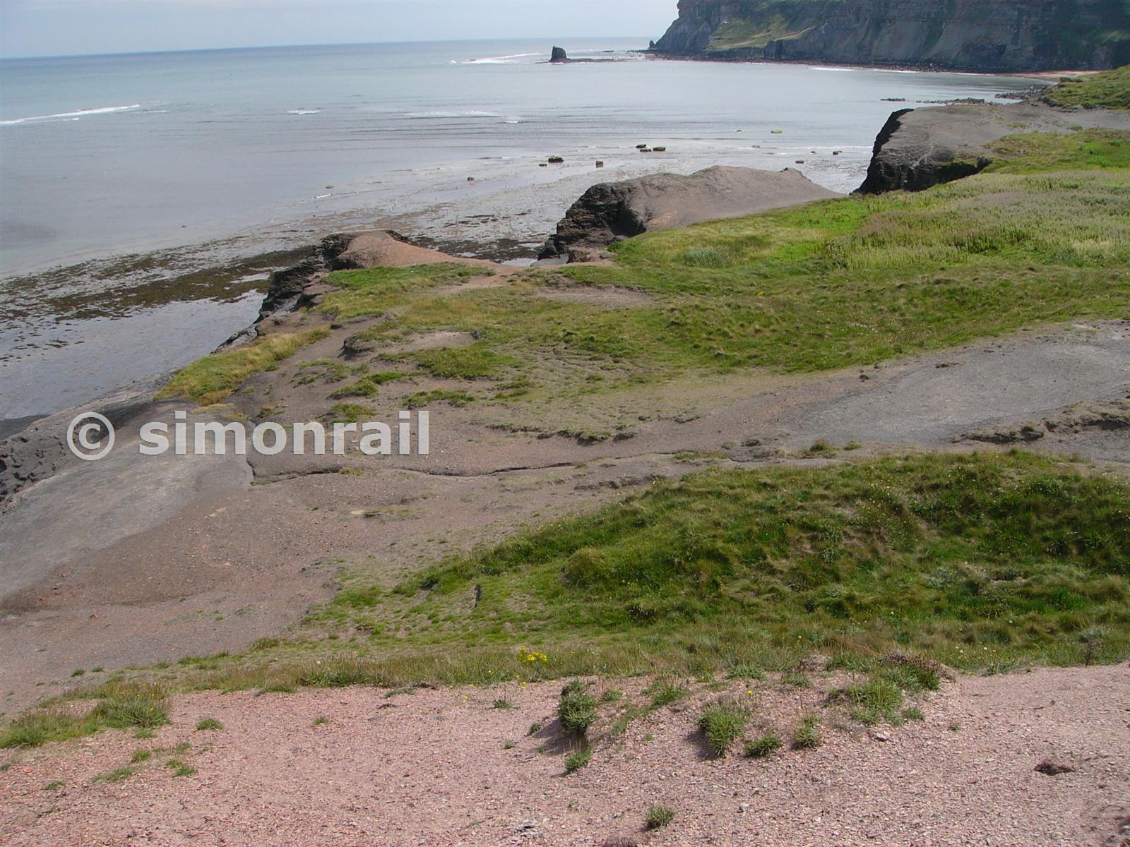 View across the quarry floor to Black Nab on the east side of the bay. Beneath the grass in the middle distance were calcining places and steeping pits.