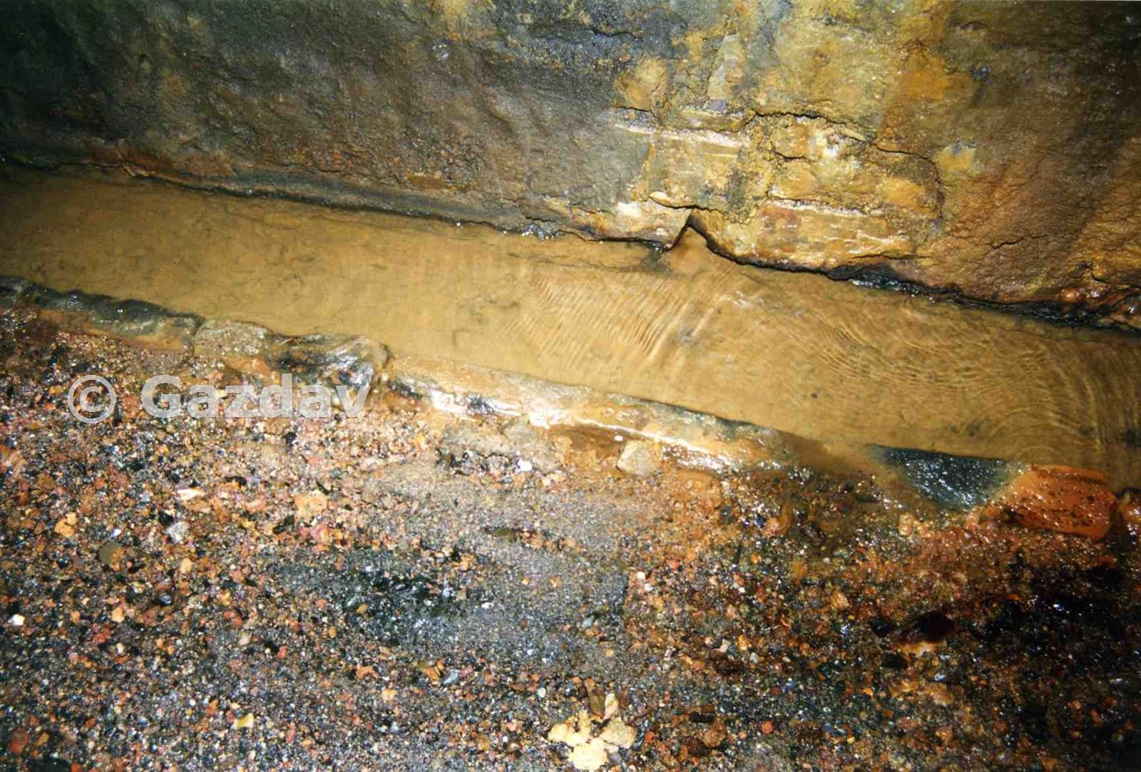 The drain running along the side of the track inside of the tunnel constantly flowing with water.