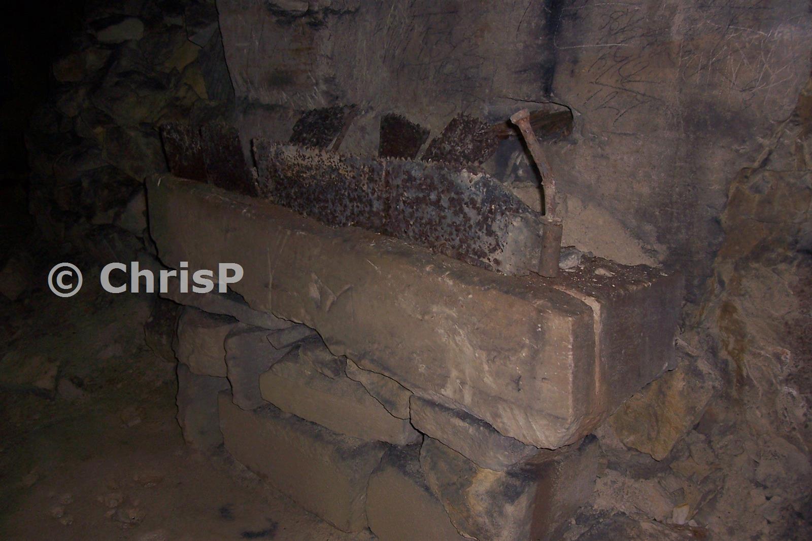 a grove cut in the slab allowed the inverted saw to be held in place while the teeth were sharpened with files.
