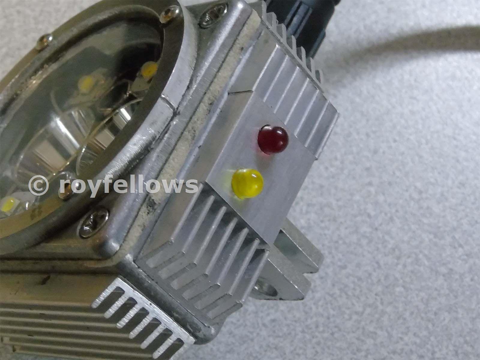 Flashing red is overheat alert, starts at 65C. Yellow is low battery, floods will disconnect in 5 seconds. Beams do a slow death so irrelevant.