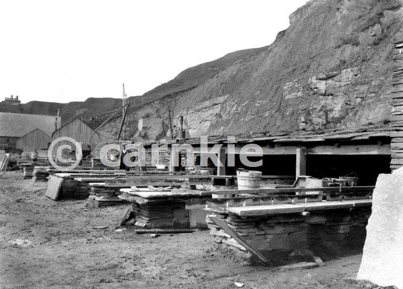 Scrabster Quarry, 2.4 km. north-west of Thurso. Caithness. A view of the processing area with cutting tables and sawing sheds with a steam-driven crane in the background. Flagstone cutting tables with hand-saws in position. A great depth of boulder clay overlying flagstones, forms cliff in background. Note how flagstones are used for cutting tables, and the roof of the sawing sheds. Waste was often used to build local dykes. The thick overburden of boulder clay or till is a much more recent glacial deposit than the underlying Devonian (Old Red Sandstone) Caithness Flagstones. Photo P000017. Reproduced with the permission of the British Geological Survey ©NERC. All rights Reserved.