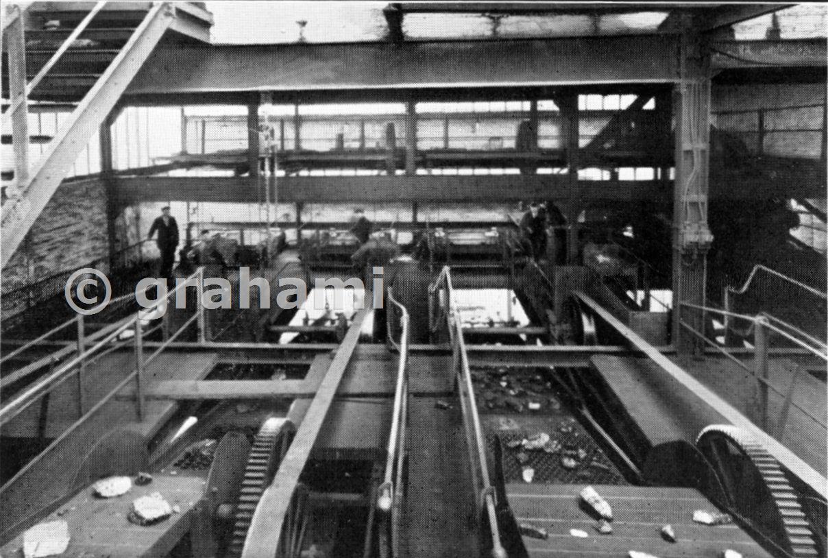 Caption "In this picture the coal can be seen reaching the ends of the belts, passing over grids through which any remaining small coal drops, and then being loadedc into wagons by speacial loading jibs. These jibs can be lowered to the bottom of the wagon so as to avoid breaking up the coal."