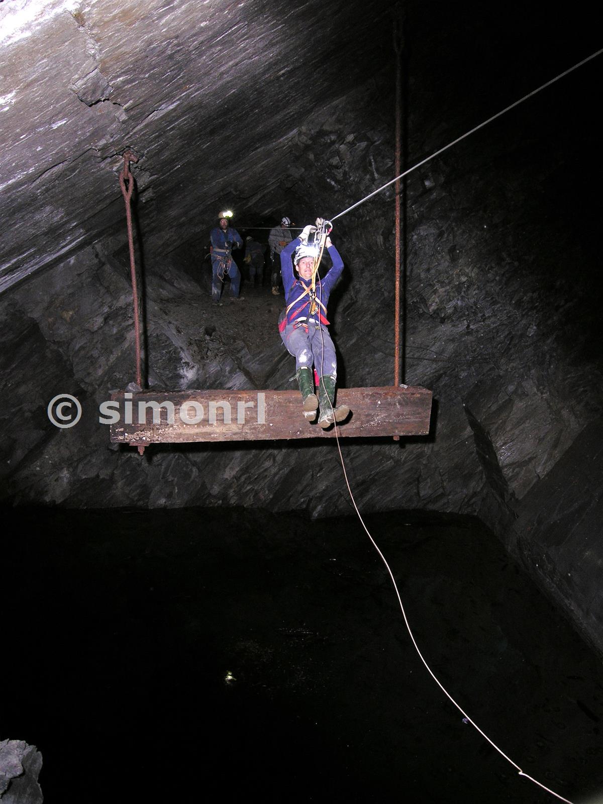 Vanoord crosses the second zip wire traverse. In deference to not having to look at the horrors ahead of him, he goes backards...