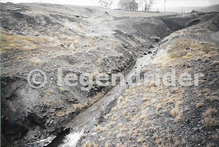 Detail of stream bed showing erosion-revealed features, highly probable base of culvert. Was this once covered over? Burtree Pasture blacksmiths shop is the small building just visible in upper RH corner