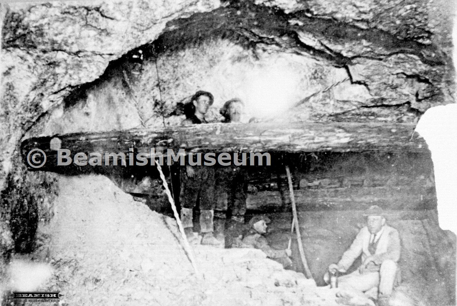 Norman Benson, Fred Armstrong, Joe Benson and George Irestrail in stope, Settlingstones Witherite Mine. Date:c1930, from the Beamish Museum Photoarchive