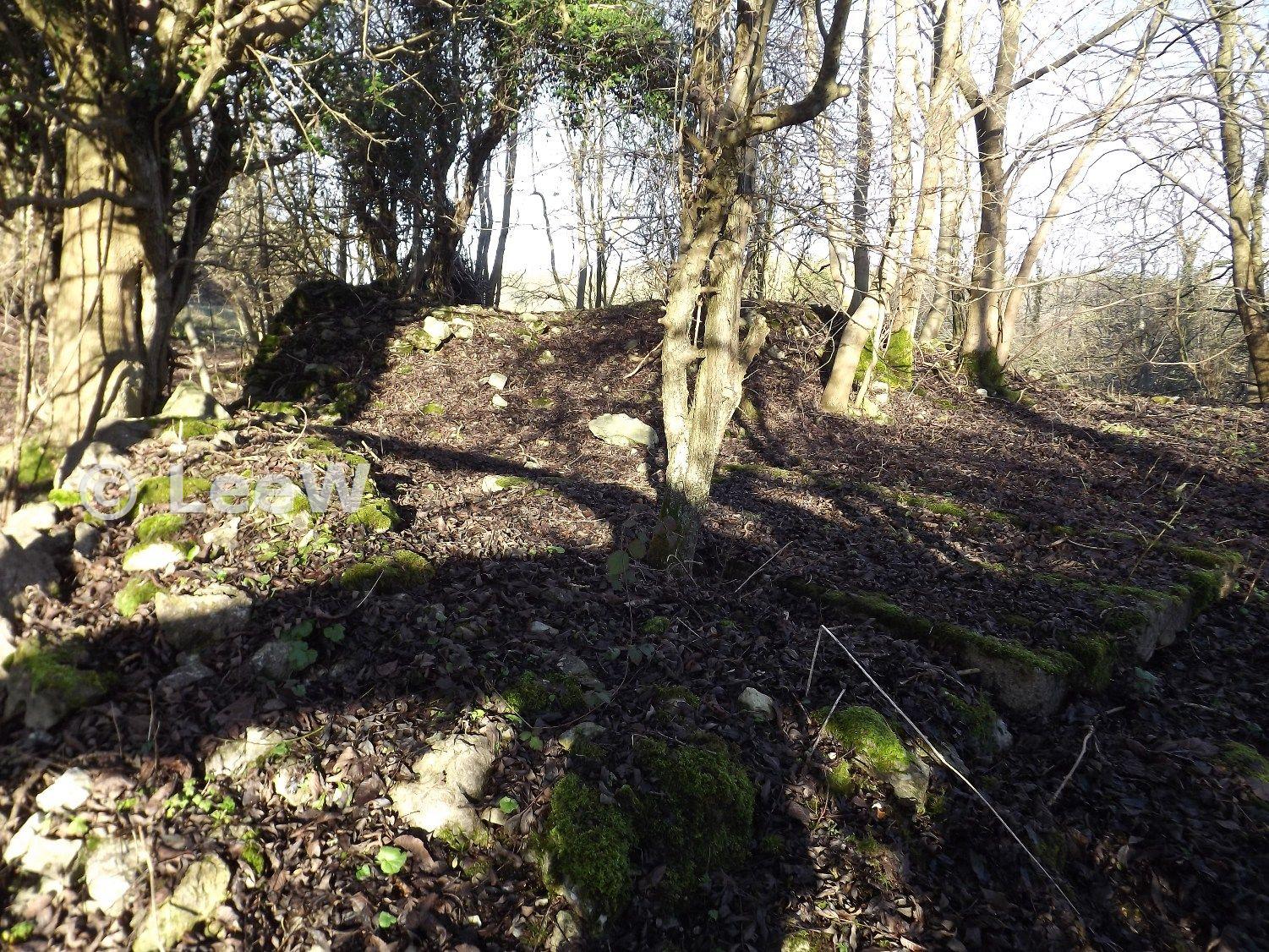 View of the sleeper capped shaft with the remains of a wall (possible part of coe / belland yard structure) with a platform beyond and above the shaft (possible gin area)