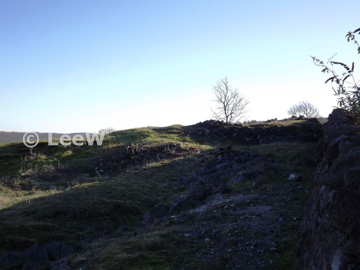 View looking southeast towards shaft mound with ruined coe and sleeper capped shaft (December 2012)
