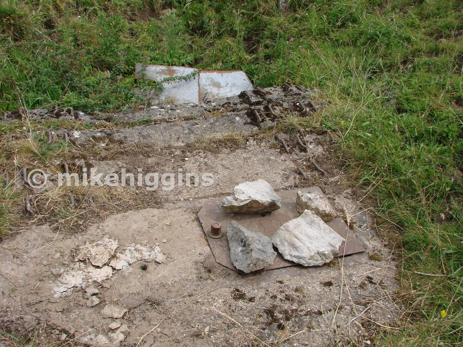 Top of the shaft covered with concrete and sleepers, showing metal lid