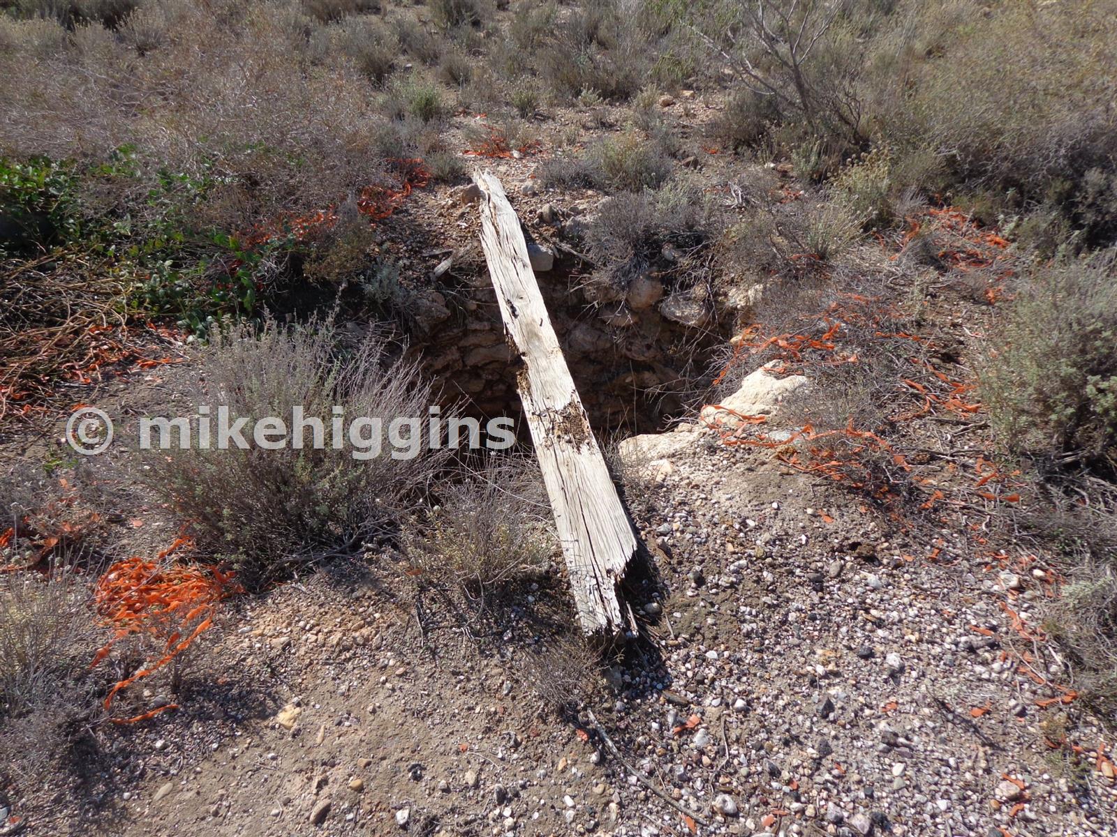 The top of an open shaft not far from the road. Health and safety measures appear to consist of scattering some orange netting on the ground round the shaft and putting an old beam across the top!
