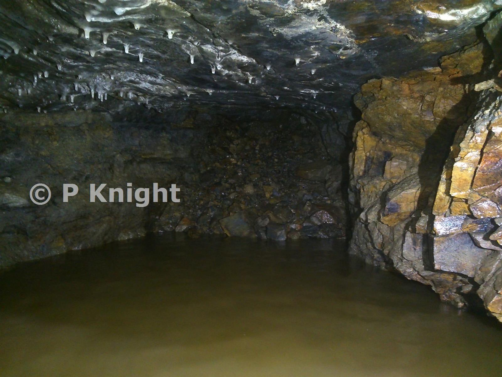 Chest deep in water and surrounded by crumbling rocks on an unknown floor makes this particular part of the mine a true delight. The rubble is possibly from the shaft that remains unlocated on the surface that should be to the east of the stream on the fields edge.